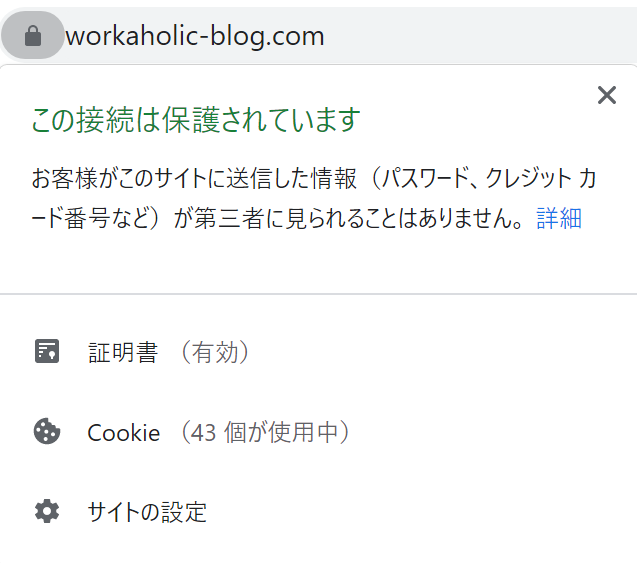 URL左側の南京錠マークをクリックすると「Google Chrome」であれば以下のよう画面が表示されます。